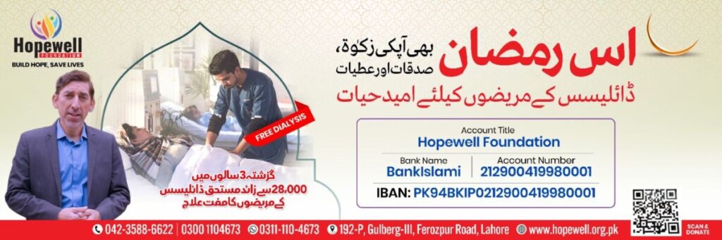 Hopewell Foundation is a Registered  non-profit organization dedicated to supporting kidney disease patients. As a purely charity-based initiative, we ensure the rightful utilization of all donations .Globally, kidney diseases rank 7th among the top 10 causes of death. In Pakistan, more than 17 million people suffer from chronic kidney disease (CKD), and over 60,000 individuals lose their lives annually due to kidney-related illnesses.